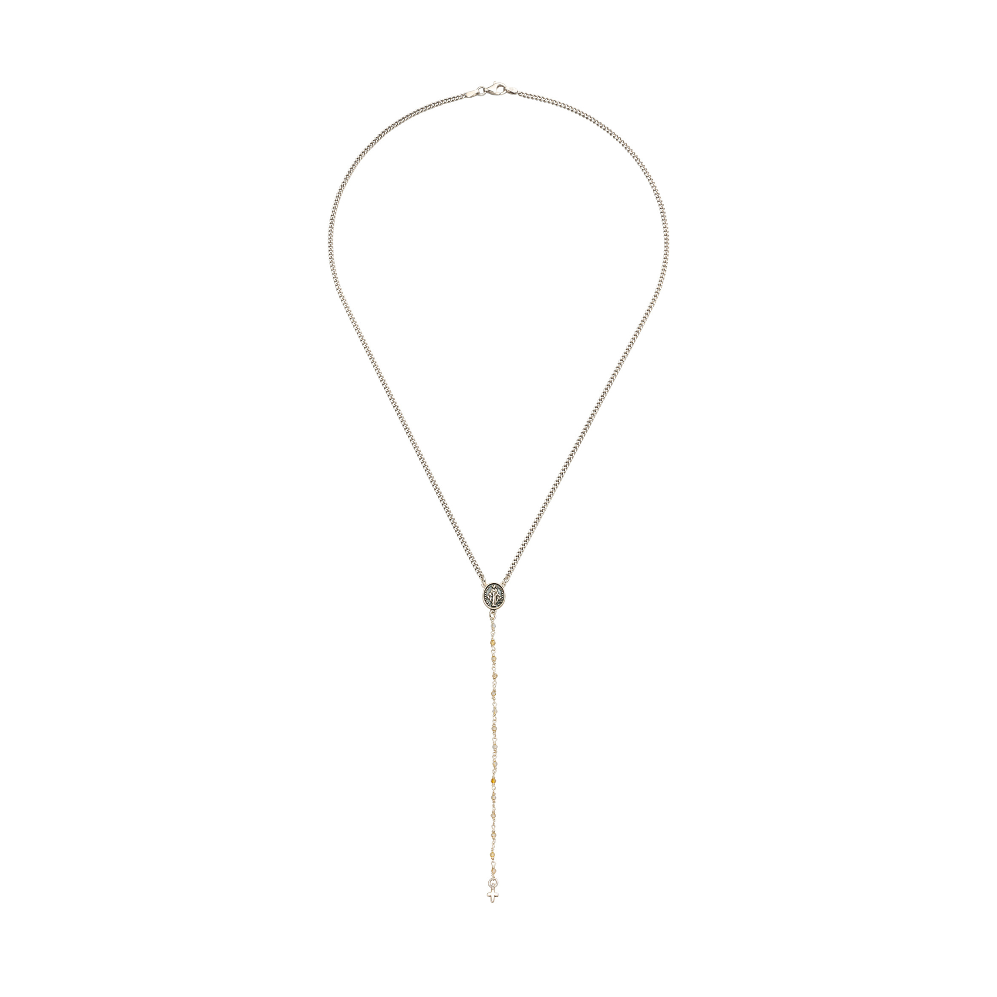 Moderne Rosenkranzkette aus Sterling Silber mit Citrin, Madonna-Amulett & Kreuz. Spirituelles Schmuckstück für Schutz und Klarheit.